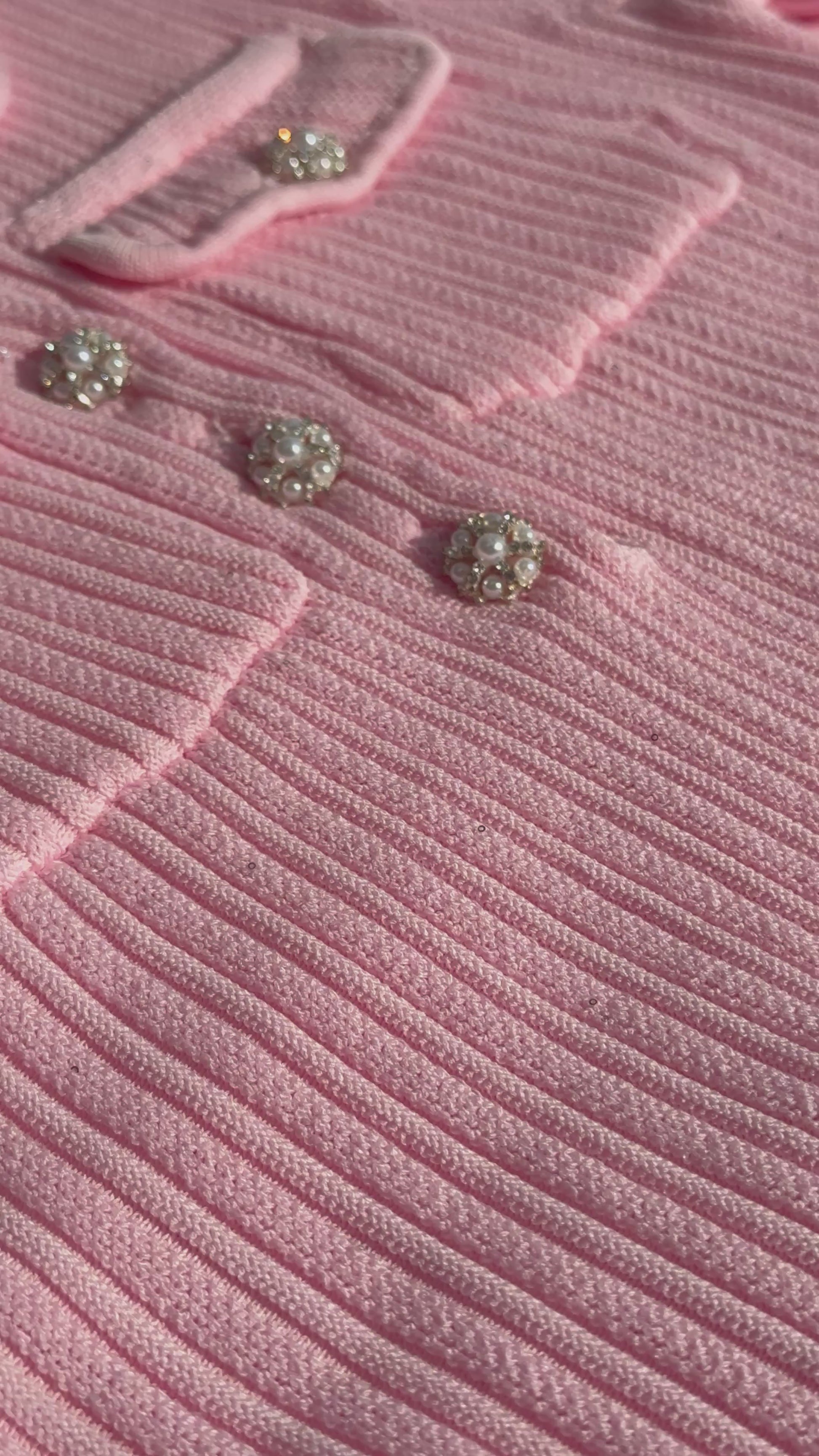 This light pink ribbed knit polo dress adds subtle sparkle to a timeless silhouette. Designed and made in Italy, it features a collared neckline, pearl-style buttons, and shimmering threads woven through the soft stretch fabric for a refined, luminous look. The fitted cut flatters the figure, while decorative flap pockets complete the design. Perfect for brunch, events, or elevated casual wear.